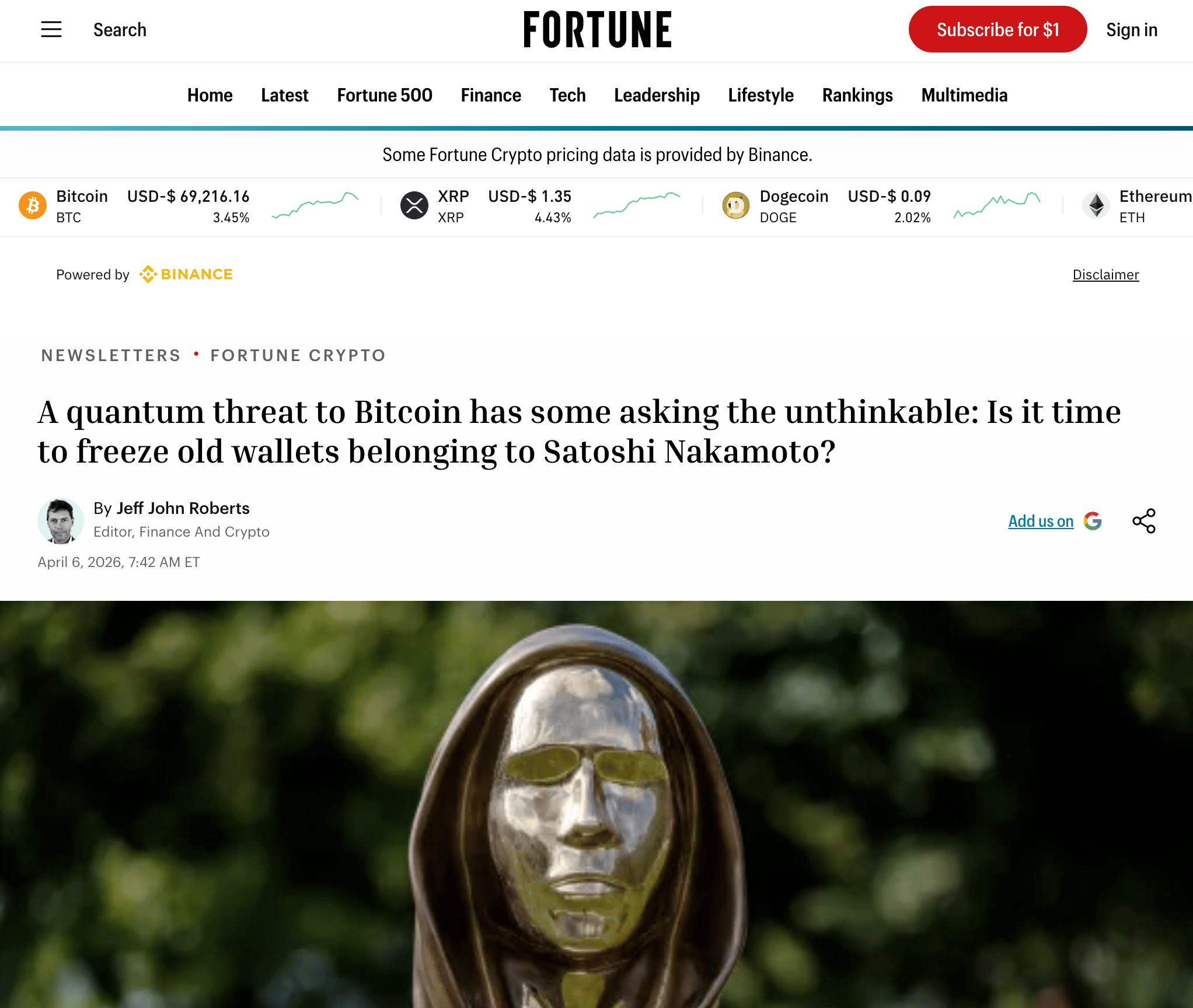 Rizzo's perspective on the quantum debate landed in Fortune this week. The piece, by Finance and Crypto Editor Jeff John Roberts, covers the calls to freeze Satoshi's wallets ahead of a potential quantum threat — and quotes Rizzo directly on why a compulsory upgrade would be anathema to Bitcoin's core values.